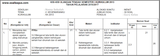 Soal UTS Kelas 3 Tema 6 Sub Tema 3 dan 4. Format Kisi Kisi Soal PH Kelas 5 Tema 1 Kurikulum 2013 Revisi tahun Terbaru dalam format doc ini sudah bisa anda unduh melalui tautan di bagian bawah sebagai rekomendasi kami menyarankan BapakIbu Guru unduh juga berkas pendukung seperti Kunci jawaban dan Contoh soal di bawah ini. Kisi-kisi soal UH Tematik kelas 3 yang Admin akan membagikan contoh Kisi-kisi ini untuk tema 5 K13 Revisi 2018.